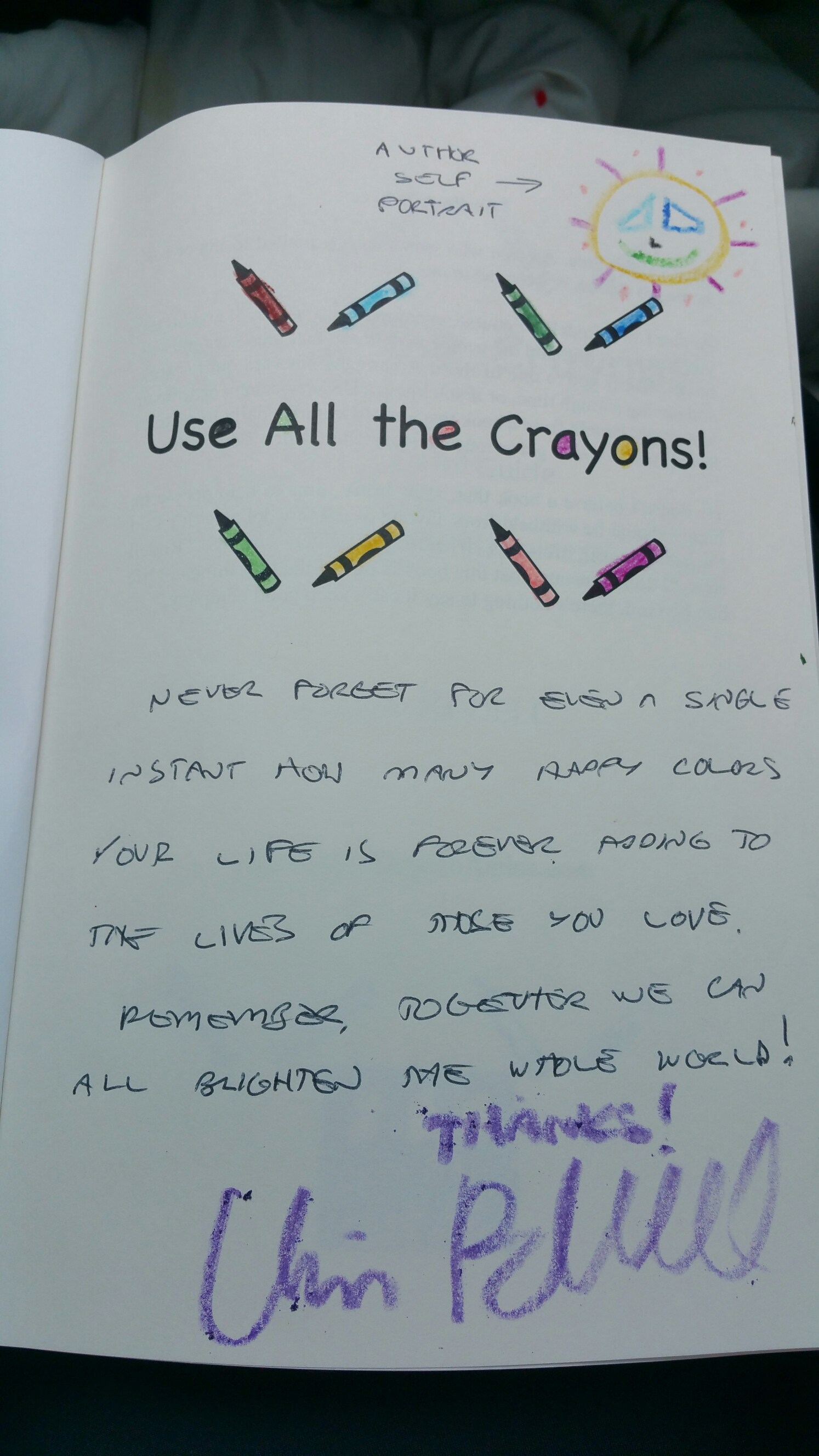 Didn’t buy any crafty stuff at the craft show. Got some ideas of what I want Adam to make me when he learns welding. There were whirly-gigs and fountains that are currently topping my list. The show changed a good bit in the 18 years since we were there last. It’s sad really how much things did change, but it was wonderful to see how much they didn’t, too. They added a place where authors can hawk their wares, too. Book signing, meet and greet, press the flesh… The first author on the right caught my eye immediately and we ended up going BACK to his booth to buy his book. Chris Rodell wrote a wonderful book entitled “Use All The Crayons”. Adam wanted it (it’s a book, go figure), I wanted it, Amandya wanted it. It wasn’t practical to buy 3 copies. I was hoping to read it before it disappeared into Adam’s vortex. It disappeared. I bought the Google reader version (I’m SO glad I still had some money from winning the gift cards in May at the Oracle User Group days) and have been devouring it. I highly recommend the book. It is an easy read. It makes me smile. It makes me remember that there are times when just being and using ALL of the crayons in my box are just as important as buying more crayons. I’m hoping to be able to justify buying another copy of the ‘real’ book (maybe complete with signature) eventually. In the mean time, I will read my digital version, gracefully not write in Adam’s copy and take the book to heart. I hope Adam actually gets off his duff and starts writing his.