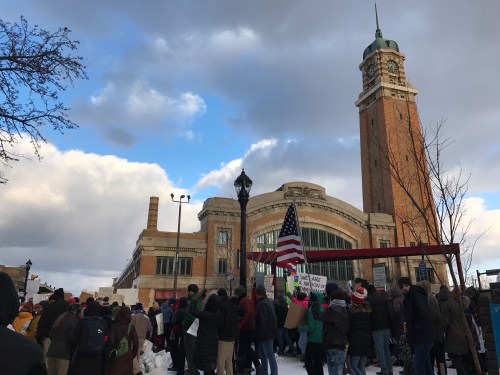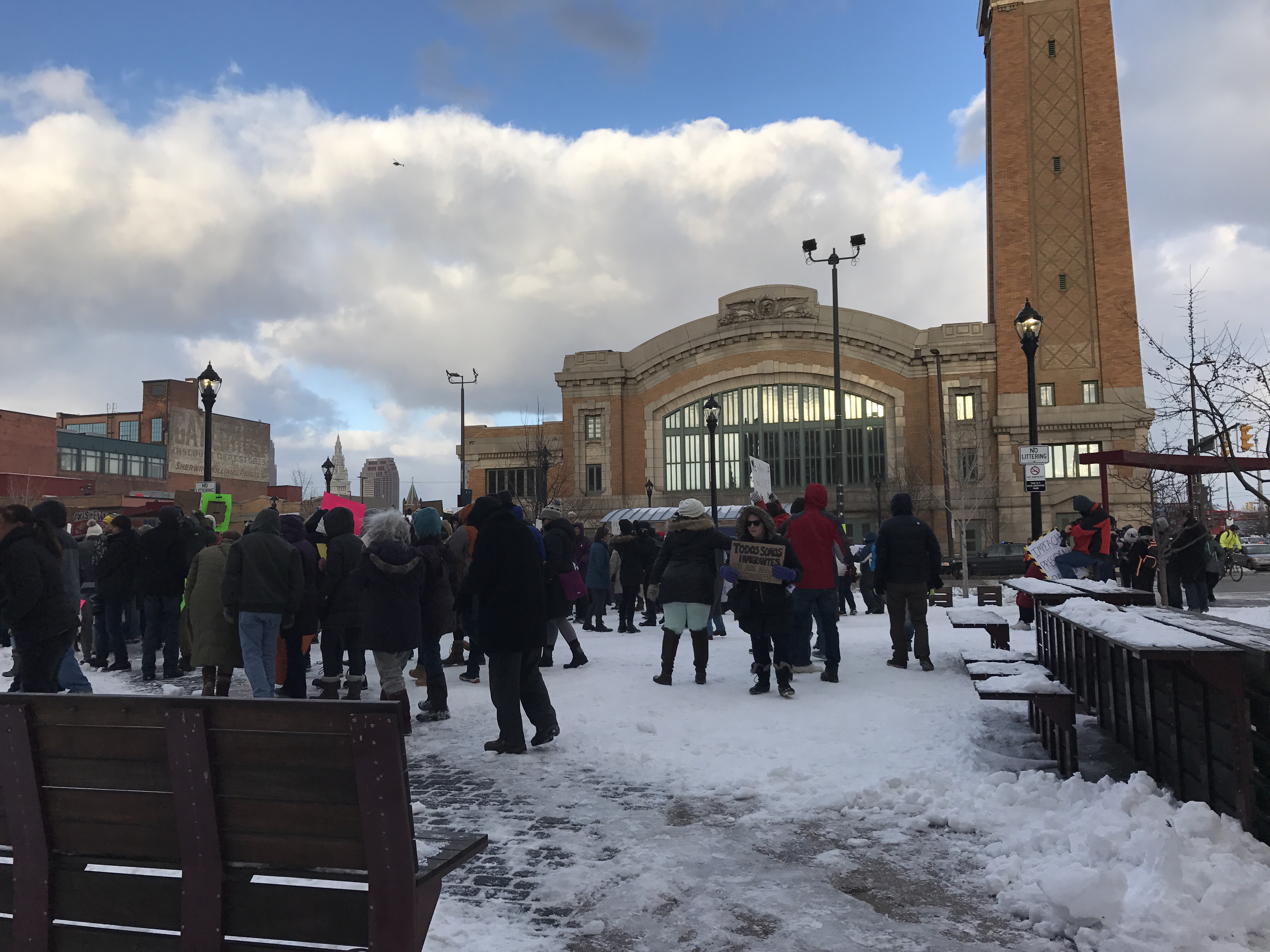 3. It was a freaking cold day in Cleveland and nearly everyone was dressed for the weather.  You know what?  You could not tell what religious preference anyone had.  You could not tell what nationality or “race” someone was except between the tops of scarves and the bottom of knit hats.  All you could really tell is that humanity was gathered together, shoulder to shoulder, arm in arm, side by side, trying to have their voices heard.  There was not a single piece of litter on the ground (however the ice and snow in the square was kind of dirty and yicky and footing was sometimes a bit dicey).  The protesters where coming together with their neighbors simply to be heard.