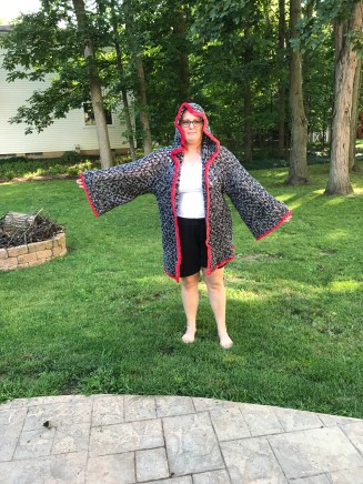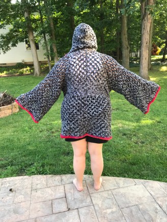I’ve fallen in love with my Campfire Cardigan crochet pattern.  I’m getting compliments on the one I made me.  It’s finished and it worked up really fast.  I love the way it hangs and the hood on it that I can almost totally hide in.   Squirrel’s is nearly finished (three days in) and it will be done in plenty of time for her birthday.  Next (if he snags me enough yarn) one for Monkey Butt and one for his friend from far away.  I started my green version but I am not hurrying through this one.  I’m trying to decide if I want to cook up a bunch of these to put on Etsy to see if I can make some extra money… but I don’t know if anyone would bother to buy one given the price I will have to charge just to cover the yarn and anything over and above that.