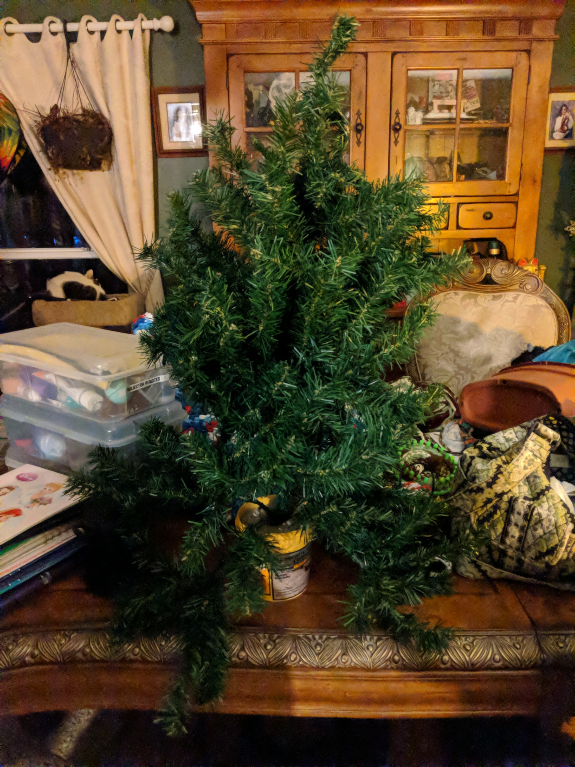 Today I ran past (on my NORMAL cul de sac) a Christmas tree… complete with lights… laying in the trash. I told myself if that one was still there when I swung back home I would maybe snag it. It was in really good shape (the lights even work) but it is a 6 or 7 foot tree. I know a smallish squirrel girl who has been trying to find a tree of her own to adopt. Turns out that tree WAS there on my way back but that isn’t where this story is headed.