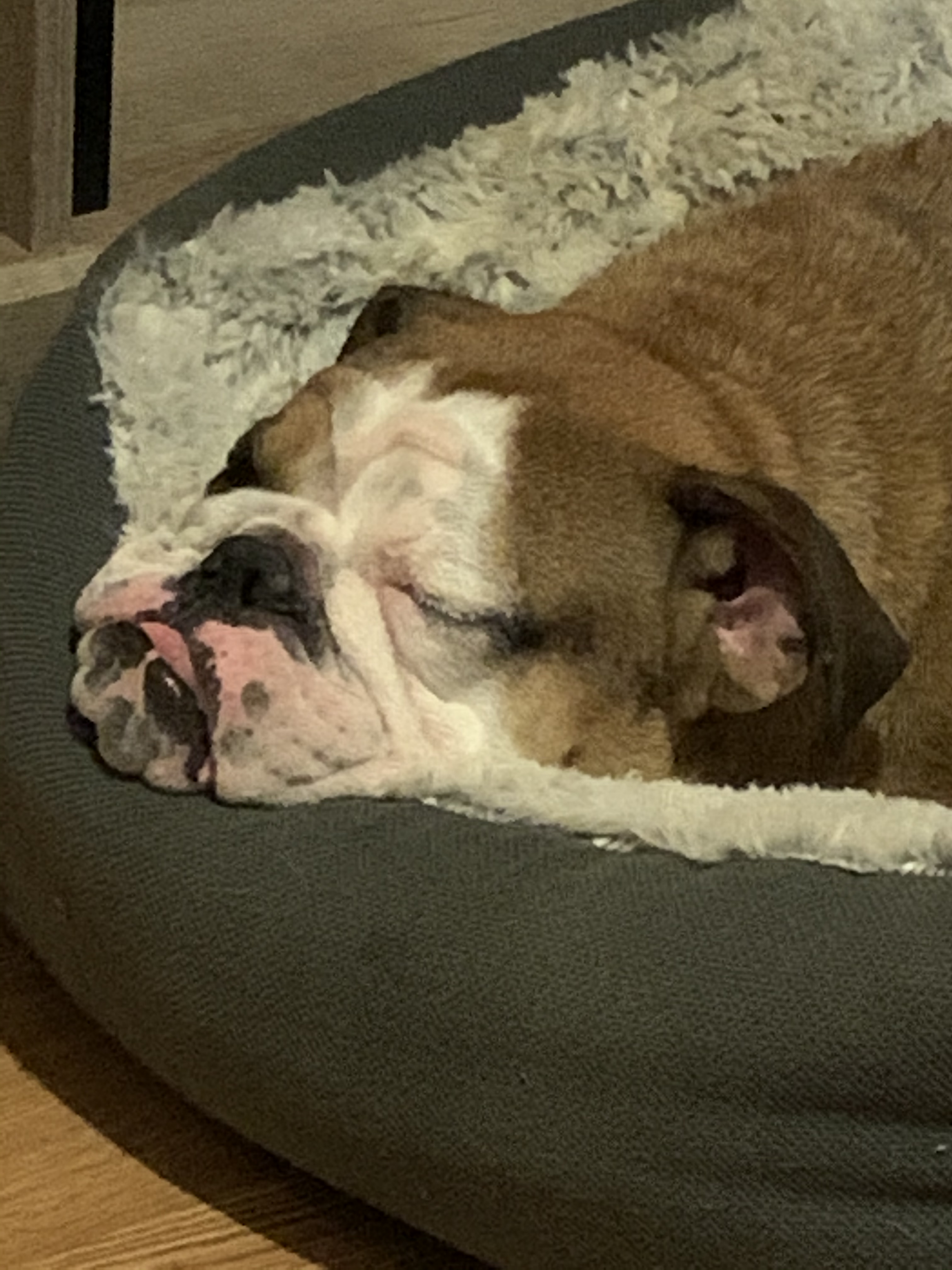 We went to “our” shelter (where all of our doggos seem to come from now) and two others. Ours was the only one that answered the phone on Sunday. We were heading up the highway to another shelter when I called and was put on hold and we kept going and going and going. We were ALMOST past the turn off to our shelter when they came on and said, yes, they have an English Bulldog but he won’t be available until either Monday or Tuesday. So we QUICKLY (we were ALMOST past where we could turn off the exit) turned up to go see.