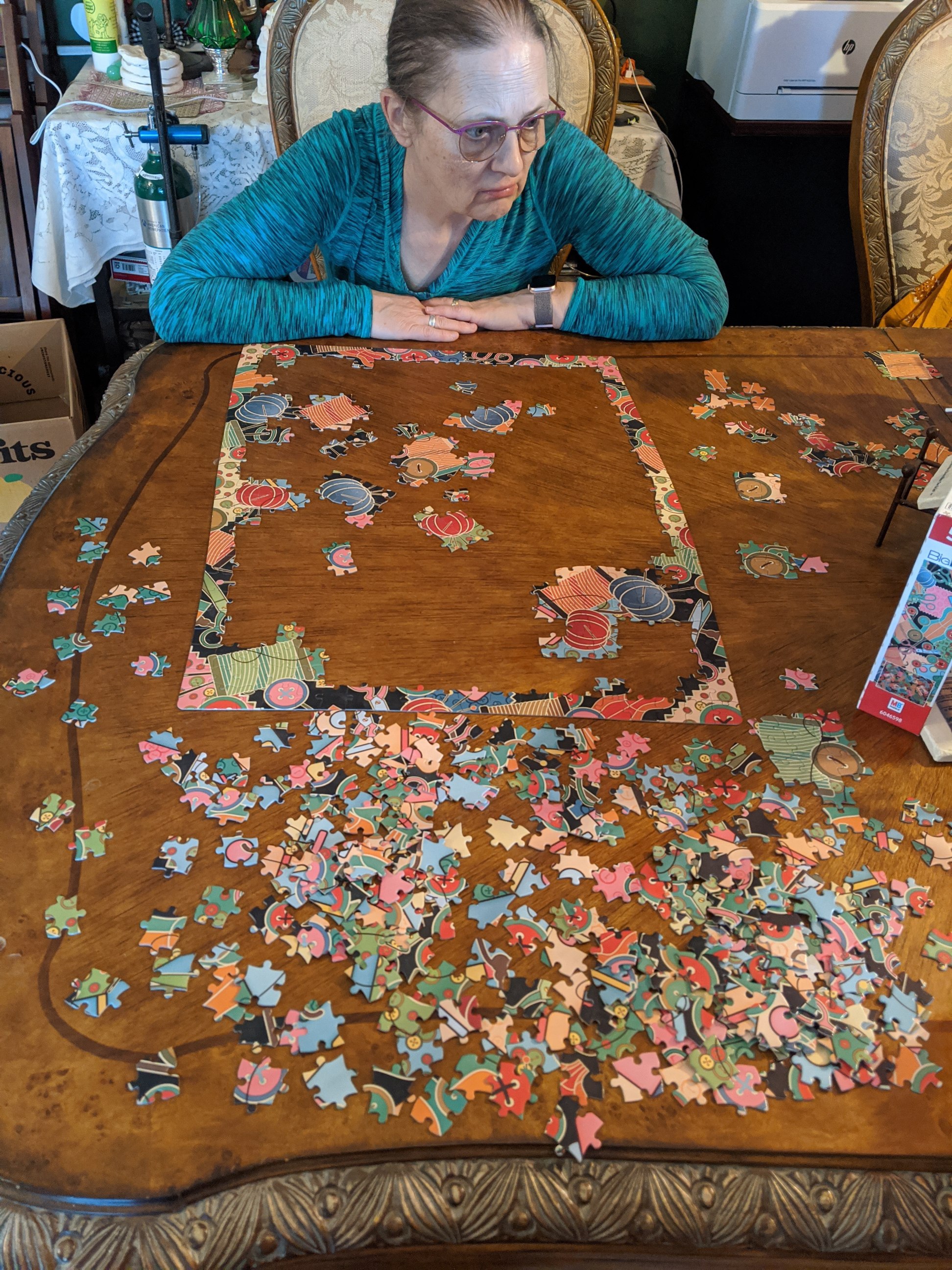 And the kids and I are starting to put puzzles together. Once upon a time mom and I put puzzles together. I was very very little and I remember sitting in the living room at a card table, sunlight streaming through the sheers, putting together puzzles. It’s been what feels like a lifetime ago (and it really is) since I’ve taken the time to sit down and put together a jigsaw puzzle. Monkey Butt bought two at Walmart a couple weeks ago and we started the 500 piece one. I bought two on Amazon and this morning we picked up a quarter of a put together puzzle so we can put together the one that shows books on a bookstore shelf. Monkey Butt says he’s incredibly sorry that it has taken the current situation for us to do this but he’s really glad we are doing this and he hopes that it doesn’t stop when the the world stops turning turtle (new Mary Poppins… it’s a song worth listening to). I hope so too.